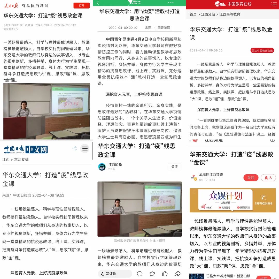 编辑按:一线场景最感人,科学与理性最能说服人,教师榜样最能激励人。自学校实行封闭管理以来,华东交通大学的教师们从身边的故事切入,以专业的视角剖析,多措并举、身体力行为...