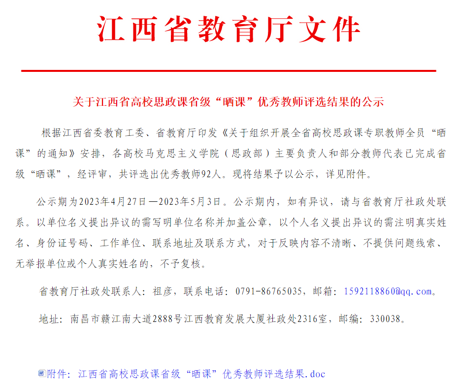 日前,江西省委教育工委、省教育厅公布江西省高校思政课省级“晒课”优秀教师评选结果,我院张剑锋获评马克思主义学院(思政部)主要负责人(本科组)“优秀”思政课教师,张静、...